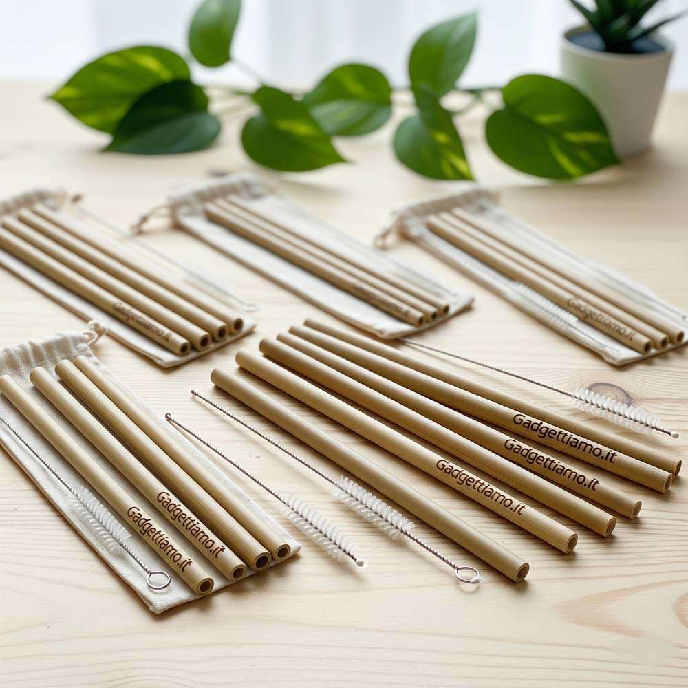 Set di 2 cannucce di bamboo riutilizzabili, con spazzola di pulizia in acciaio inossidabile e nylon, in sacchetto di cotone. Il bamboo è un materiale naturale pertanto la superficie e lo spessore possono variare.