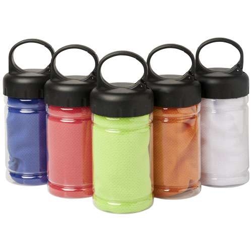 Asciugamano rinfrescante ad assorbimento rapido, ad asciugatura rapida e lavabile, realizzato in poliestere resistente e duraturo, per rimanere freschi durante l'allenamento o attività all'aperto. Fornito in un contenitore in PET con maniglia e moschettone integrato per un facile trasporto. Disponibile in 5 nuovi colori. Ampia area decorativa del logo sul contenitore, decorazione possibile anche sull'asciugamano stesso. Dimensione: 30 x 80 cm.