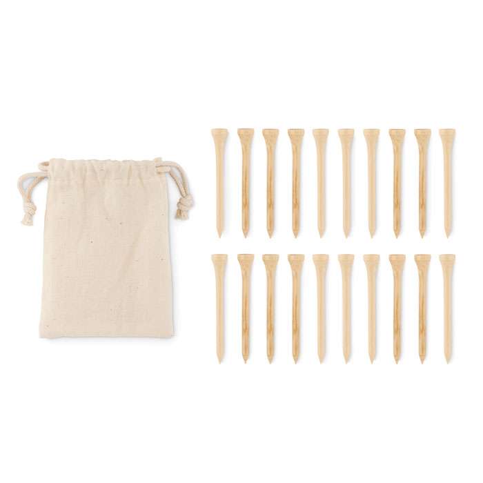 TSet tee da golf in bamboo presentato in sacchetto con coulisse in cotone biologico.