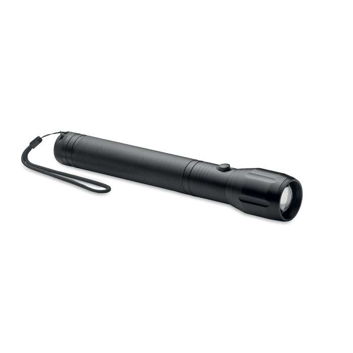 Grande torcia in alluminio con zoom, 1 LED e tracolla removibile. Potenza: 300 lumen. 3 batterie D escluse.