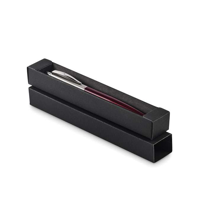 Penna a sfera a pulsante con fusto in acciaio inossidabile riciclato. Inchiostro blu. Presentata in una scatola nera.