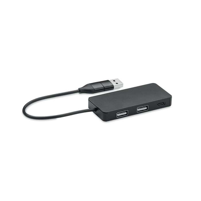 Cavo di ricarica in alluminio riciclato. Uscita: 2 x Tipo A e 1 x Tipo C. Ingresso: tipo C e tipo A 2 in 1. Lunghezza cavo: 20 cm.