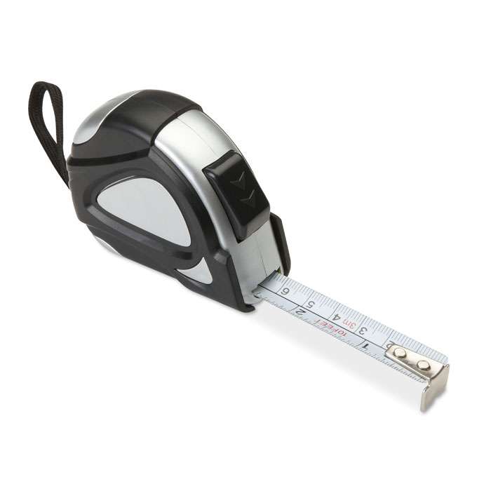 Metro in ABS in colore nero e silver. Laccetto incluso, clip in metallo. Lunghezza 3mt.