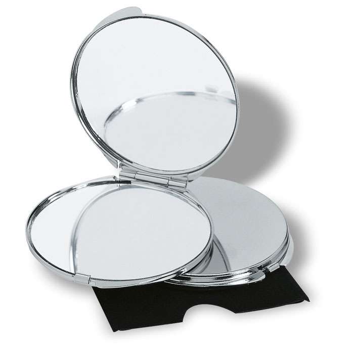Specchietto con riflesso reale ed ingrandito, in metallo cromato. Confezionato in astuccio in velluto.