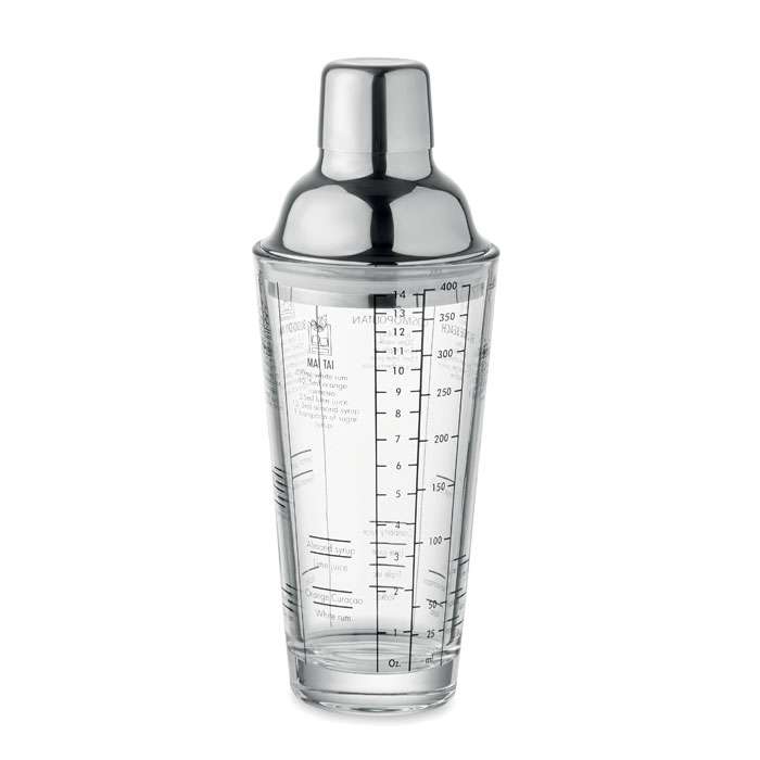 Shaker da cocktail in vetro con coperchio in acciaio inox con stampa di ricette cocktail e misure. Capacità: 400 ml.
