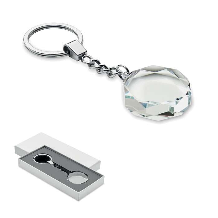 Portachiavi rotondo in vetro. Presentato in una confezione regalo.