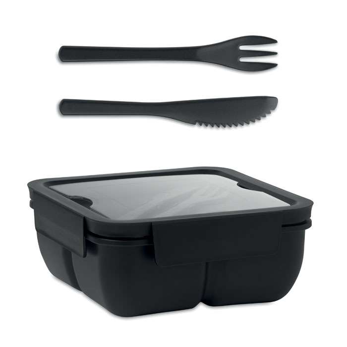Portapranzo in PP con 2 comparti. Il coperchio include un set di posate. Contenitore da 600 ml.