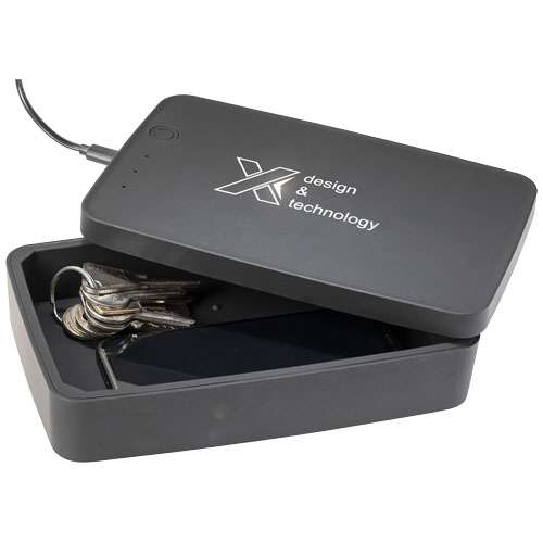 Scatola di ricarica igienizzante UV-C con finitura in gomma e cavo di ricarica USB-C realizzato in RPET. La tecnologia UV-C neutralizza in 3 minuti il 99% dei batteri e dei contaminanti microbiologici presenti. Ampia superficie per logo luminoso con 6 lampade a LED UV-C da 3,5 W. Può essere usata per sanificare chiavi, smartphone, auricolari, carte o oggetti simili. Il coperchio della scatola dispone di un caricabatterie wireless integrato da 10 W per ricaricare qualsiasi dispositivo a induzione. Fornita in una confezione regalo nera. Brevetto EUIPO EUROPA.