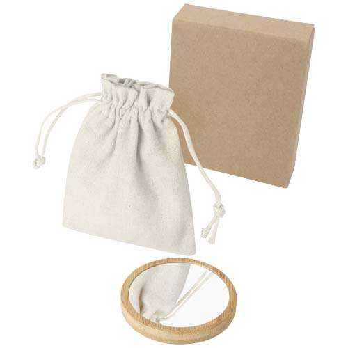 Specchio rotondo in bambù per un tocco naturale ed elegante. FornitO in un sacchettino di cotone.
