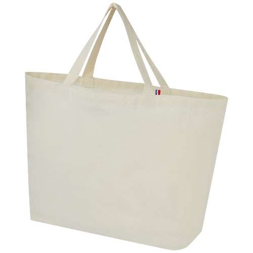 Questa Tote bag di grande capacità è realizzata con i materiali migliori, riciclati al 100%. È costruita per essere utilizzata nella vita di tutti i giorni ed è adatta a trasportare libri pesanti o generi alimentari. La miscela di cotone/poliestere riciclato da 200 g/m² garantisce durata e affidabilità, conferendo alla borsa una resistenza fino a 14 kg di peso. I filati provengono dall'Asia, ma la tessitura, la filatura e la produzione avvengono in Francia.
