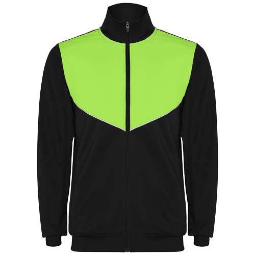 Tuta da ginnastica in tessuto leggero ed elastico. Giacca con colore a contrasto e finiture cucite sul petto. Colletto alto con cuciture a contrasto. Zip anteriore centrale. Tasche laterali. Polsini e vita a costine 2x2. Pantaloni con vita elasticizzata e coulisse. Parte laterale a contrasto con finiture cucite. Orlo con cerniera.