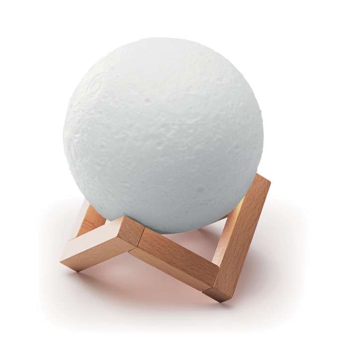Speaker wireless 5.0 a forma di luna in ABS. Luce con 2 livelli di luminosità (LED caldo e bianco). Compresa base in legno. 1 batteria ricaricabile al litio da 2000 mAh inclusa. Output: 3W, 4 Ohm e 5V. Include cavo di ricarica USB. Tempo di autonomia ca. 5h.