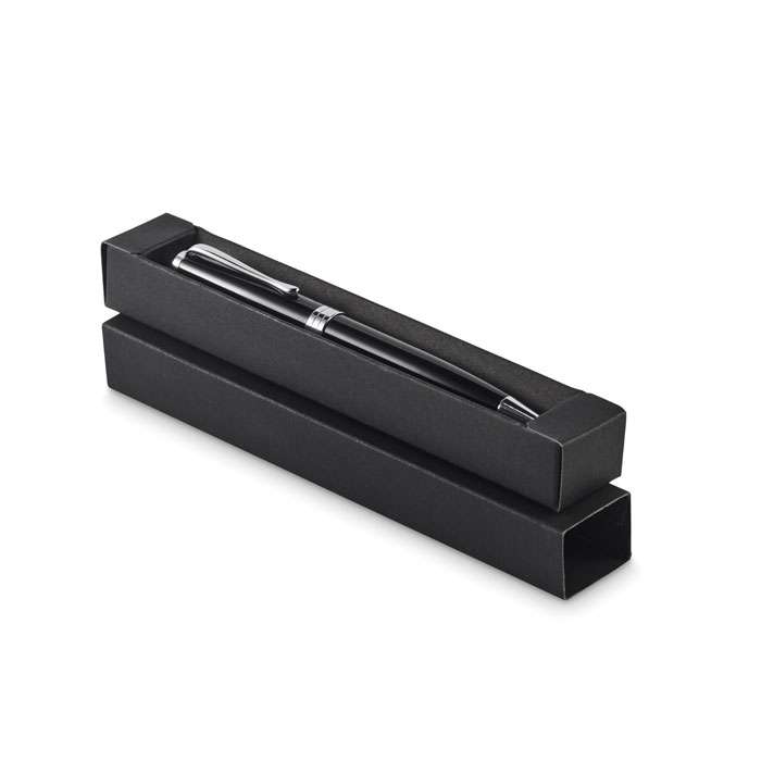 Penna a sfera a rotazione con fusto in acciaio inossidabile riciclato. Inchiostro blu. Presentata in una scatola nera.