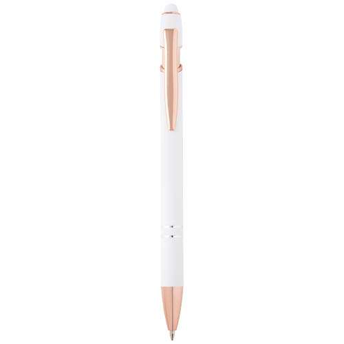 La penna a sfera Nanna con finitura oro rosa, presenta un fusto realizzato in alluminio riciclato con stilo tattile in silicone. L'alluminio riciclato riduce la quantità di rifiuti nelle discariche e aiuta a conservare le risorse naturali con l'obiettivo di ridurre le emissioni di gas serra. Colore dell'inchiostro: Blu. Capacità di scrittura: 800 metri. Dimensione del pennino: 1,0 mm.Colore inchiostro: Blue