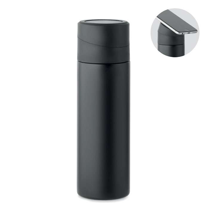 Bottiglia isolante a doppio strato in acciaio inox riciclato (90% acciaio inox riciclato e 10% acciaio inox) con coperchio ad anello in silicone antiscivolo porta telefono. Capacità: 420 ml.