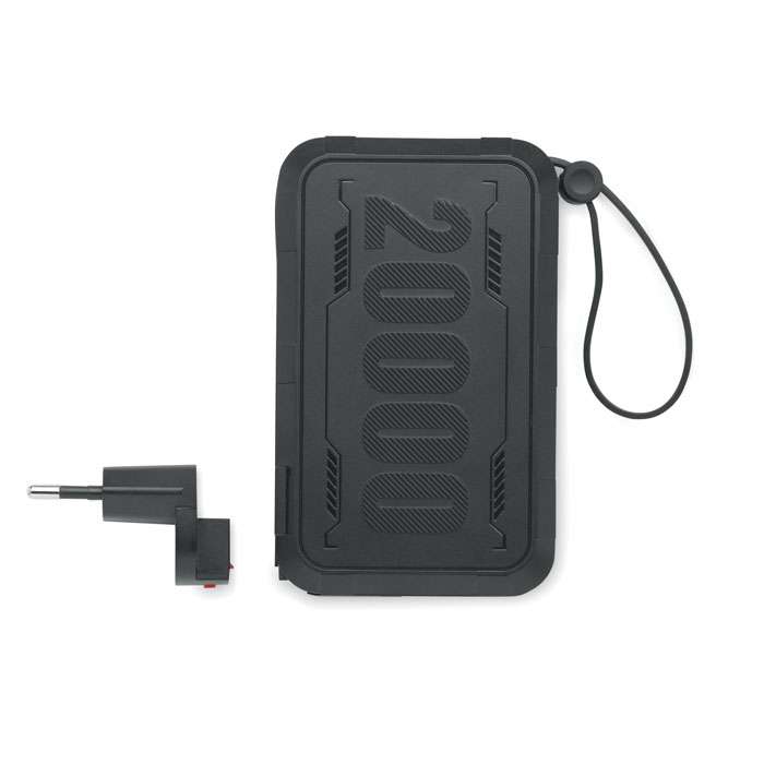 Power bank da 20000 mAh in ABS con spina USA integrata e spina CA rimovibile. Ingresso/uscita USB A e tipo-C. Cavi integrati di tipo C e 2 in 1 pin.