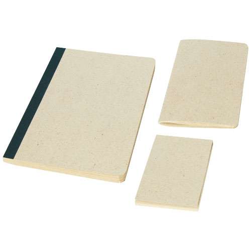 Set regalo con articoli di cancelleria composto da un taccuino flessibile da 64 fogli in formato A5, un piccolo libretto rilegato (10 x 15 cm) e un blocco di foglietti promemoria (8 x 11,5 cm). Tutti gli articoli sono realizzati in carta erba da 90 g/m² che contiene fino al 40% di fibre di erba e ha un basso impatto ambientale. Rispetto alla carta normale, nel processo di produzione vengono impiegate quantità inferiori di acqua ed energia e non vengono utilizzati prodotti chimici. Tutti gli articoli sono realizzati in Europa, aspetto che contribuisce a ridurre l'impronta di carbonio.