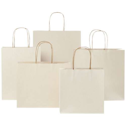 Shopper in carta XXL da 150 g/m² (31 x 12 x 41 cm) realizzato con scarti agricoli e caratterizzato da manici di carta intrecciati. La parte anteriore e posteriore personalizzabili offrono un ampio spazio per stampare un logo o qualsiasi altro design, rendendolo un ottimo strumento di marketing aziendale. Realizzato in Europa e riciclabile al 100%, questo sacchetto è una scelta più sostenibile per aziende e persone attente all'ambiente in cerca di una soluzione per il confezionamento sostenibile.