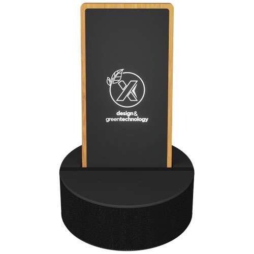 Speaker con logo luminoso e due diverse funzioni. La base è composta da 2 potenti speaker Bluetooth® da 3 W con microfono integrato per le videoconferenze. Il caricabatterie a induzione in bambù certificato è integrato magneticamente nello speaker e consente di ricaricare un telefono compatibile con una potenza di 10 W. Autonomia della batteria di circa 3 ore. Per un utilizzo ottimale del prodotto (speaker + ricarica da 10 W), si consiglia di utilizzare il cavo di ricarica in dotazione. Fornito con cavo di ricarica realizzato in PET riciclato. Dimensioni degli speaker: 9 x 14 cm. Fornito in una confezione regalo (14 x 11 x 5,5 cm) con chiusura magnetica. Garanzia di 3 anni inclusa.