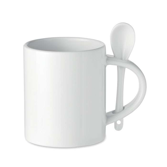 Tazza e cucchiaio in ceramica con rivestimento speciale per la stampa a sublimazione. Il cucchiaio è riposto nel manico. Capacità: 300 ml.