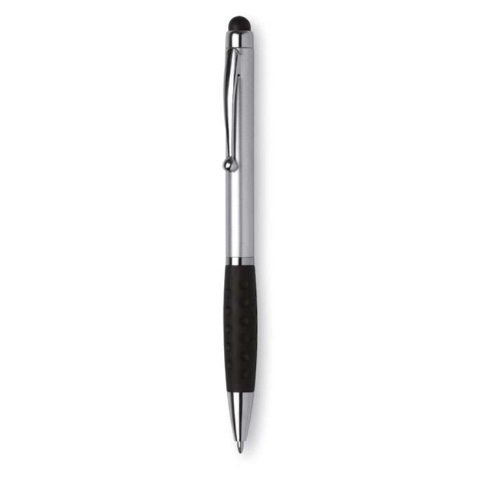 Penna a sfera in ABS con rifiniture in metallo e punta touch screen. Meccanismo twist. Refill blu.