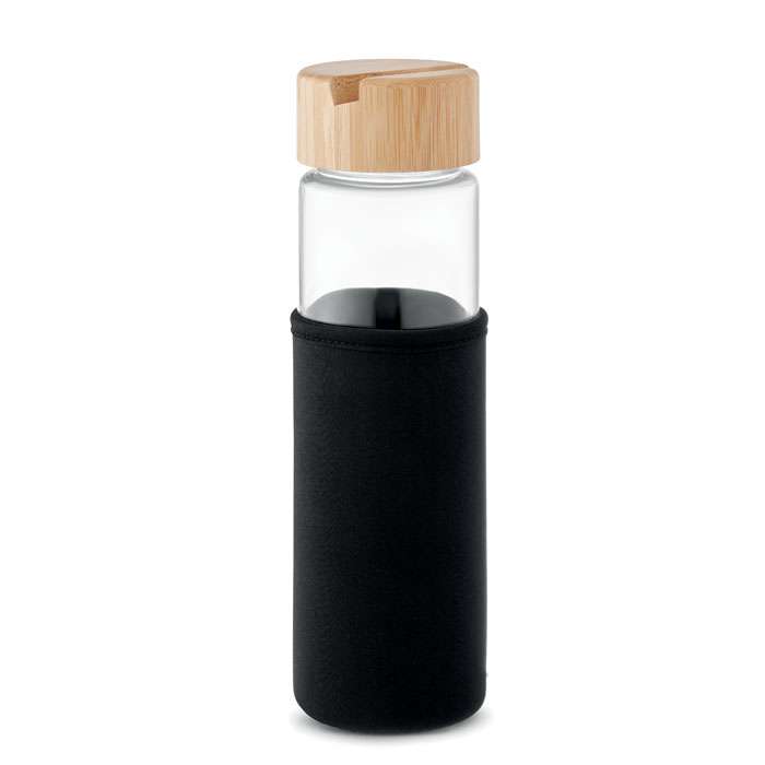 Bottiglia in vetro con custodia in neoprene, coperchio in bamboo e funzionalità supporto per smartphone. Senza perdite. Capacità: 600ml.