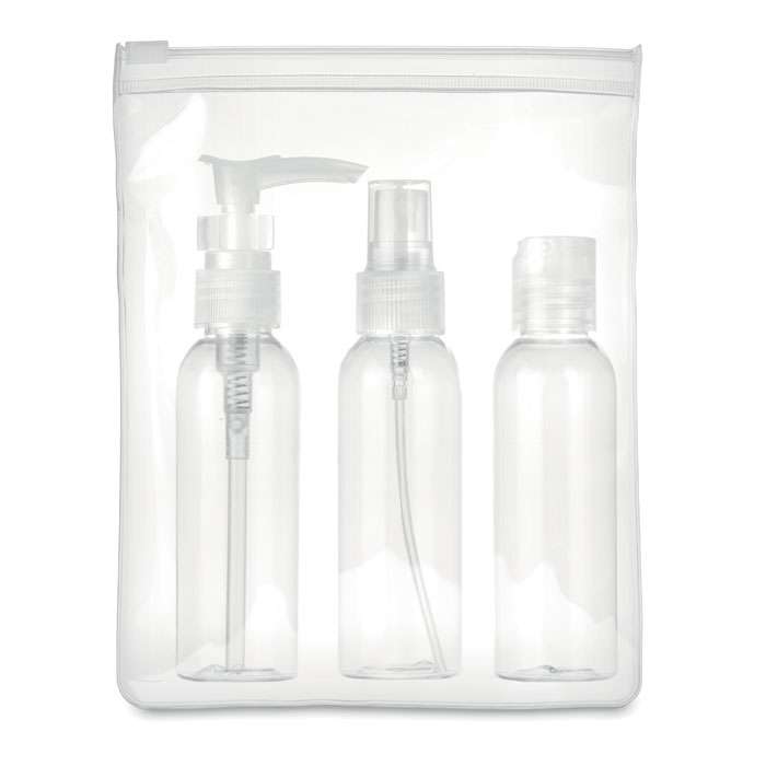 Set viaggio in pouch in EVA con 3 bottigliette vuote in PE, ciascuna da 60ml.